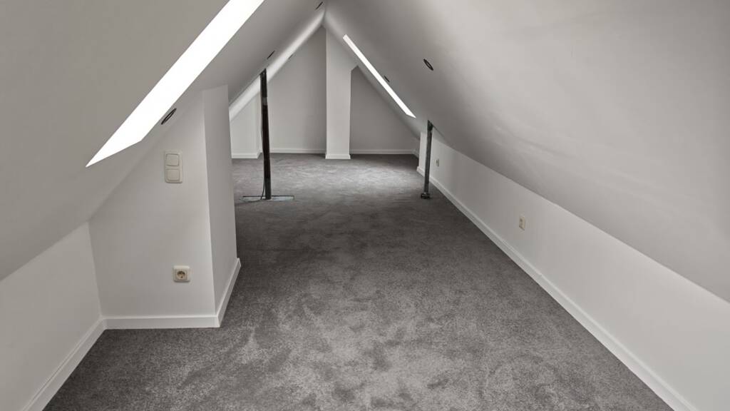 Ein besonderes Highlight ist die beeindruckende Deckenhöhe von bis zu ca. 4 Metern, die gemeinsam mit den sichtbaren Dachbalken für ein außergewöhnlich wohnliches und offenes Raumgefühl sorgt. Die integrierte Beleuchtung unterstreicht den besonderen Charakter der Wohnung zusätzlich.