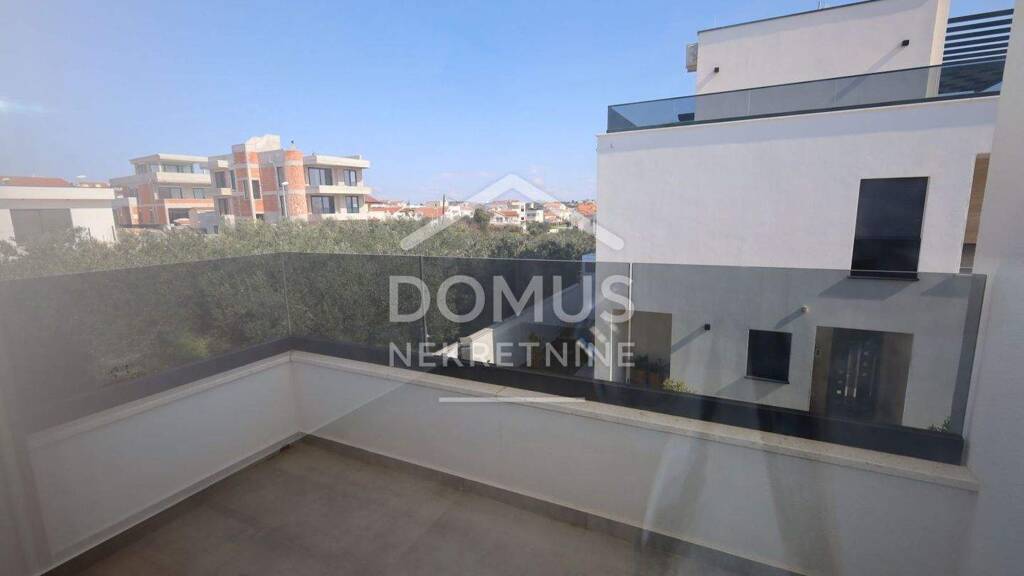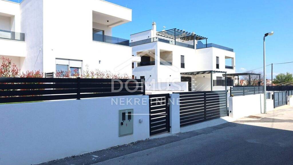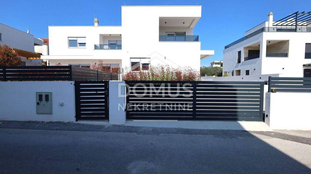 Vodice - neu gebautes, fertiggestelltes und sofort bezugsfertiges Einfamilienhaus mit moderner Architektur und hervorragender Raumaufteilung. Das Haus ist Teil eines Doppelhauses und erstreckt sich über zwei Etagen, Erdgeschoss und Obergeschoss, mit einer gesamten Nutzfläche von 166 m². Es verfügt über einen großzügigen Parkplatz für drei Fahrzeuge sowie einen angelegten Außenbereich mit einer Gesamtfläche von 139 m². Das Erdgeschoss besteht aus einem Eingangsbereich, einem Gäste-WC, einem Abstellraum, einem Schlafzimmer mit eigenem Bad und Zugang zum Pool sowie einem geräumigen, offen gestalteten Wohnbereich mit Küche und Esszimmer, mit Zugang zu einer großen Terrasse und einem Pool von 37 m². Eine Innentreppe führt ins Obergeschoss, wo sich ein Flur und drei Schlafzimmer befinden, von denen eines über ein eigenes Bad und eine teilweise überdachte Terrasse mit einer Fläche von 12,78 m² verfügt. Die anderen Schlafzimmer nutzen ein zusätzliches Badezimmer, und eines davon hat Zugang zu einer Terrasse von 3,78 m². Das Haus ist ausgestattet mit einer einbruchsicheren Eingangstür, PVC-Fenstern, elektrischen Rollläden, Insektenschutzgittern, hochwertigen Keramikböden, Fußbodenheizung in allen Badezimmern und im Wohnbereich, Klimaanlagen im Wohnzimmer und in allen Schlafzimmern sowie Anschlüssen für Telefon, Internet und Satellitenfernsehen.