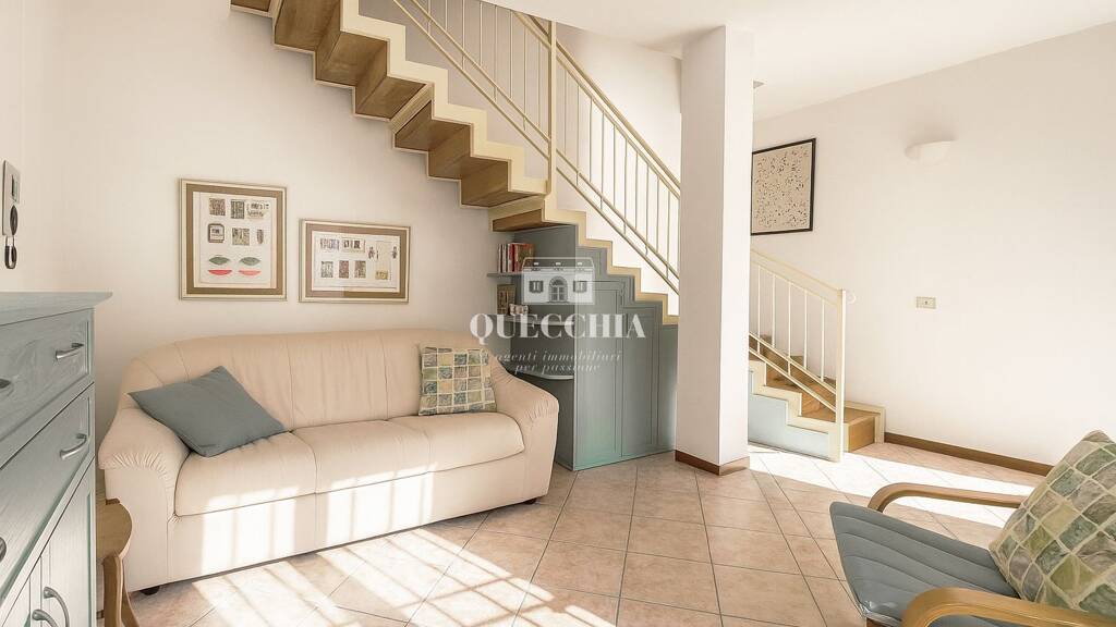 WOHNUNG IM SCHLOSS Innerhalb der alten Mauern des Schlosses von Moniga del Garda, wo sich Stille und Geschichte verflechten, liegt diese Wohnung auf zwei Ebenen, die Räume harmonisch miteinander verbinden.
