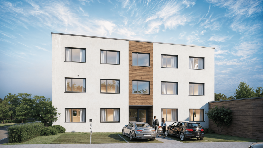 Die Wohnanlage verfügt über eine moderne Architektur und eine Photovoltaikanlage auf dem Dach.