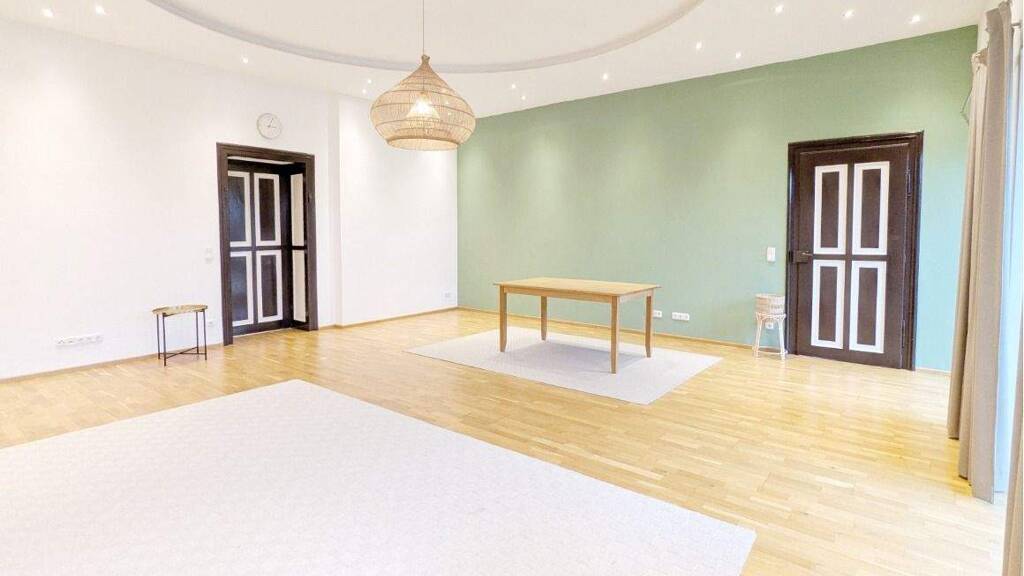Herzstück der Wohnung ist das außergewöhnlich großzügige und repräsentative Wohnzimmer mit einer beeindruckenden Deckenhöhe von ca. 3,30 Metern. Der edle Eichenparkettboden unterstreicht das hochwertige Ambiente und verleiht dem Raum eine besondere Wohnqualität. Große Fensterflächen sorgen für viel Tageslicht und ein angenehmes Raumgefühl.