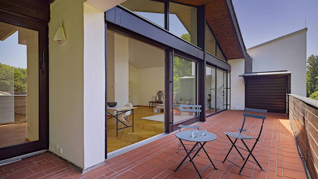Das Penthouse in der Harthauser Straße 54 ist die markante "Spitze" der Wohnanlage H54 mit insgesamt 21 Einheiten. Die Wohnanlage wurde 1974 im Stil der Moderne erbaut und gliedert sich in zwei Gebäudeteile mit gemeinsamer Tiefgarage und Poolbereich. Die kontrastreiche Fassadengestaltung aus hellen feinen Putzoberflächen und dunklem Holz und Metalleinlagen verleiht dem Gebäude seine geometrische Klarheit und grafische Wirkung. Die Fassade und das Dach wurden im Jahr 2023 komplett überarbeitet. Die großzügigen Erschließungsflächen verleihen dem Haus ein hochwertiges Erscheinungsbild. Eine Aufzugsanlage verbindet alle Etagen und ermöglicht einen barrierefreien Zugang.