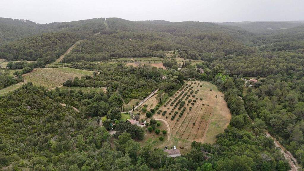 Das Anwesen erstreckt sich über Weinberge der Appellation Côtes de Provence, Olivenhaine in der Produktion und ausgedehnte private Waldflächen, die ein harmonisches Gleichgewicht zwischen landwirtschaftlicher Nutzung und souveräner Natur bieten. Es umfasst etwa 5,4 Hektar Weinberge mit der geschützten Ursprungsbezeichnung Côtes de Provence, 2,5 Hektar Olivenbäume in voller Ölproduktion sowie 1 Hektar Weinberge, die zur Wiederbepflanzung bereitstehen, was dem Ganzen ein qualitatives und entwicklungsfähiges landwirtschaftliches Potenzial verleiht. Die Domäne wird von einem klaren Fluss mit wilden Ufern und atypischen Seeufern begrenzt und bietet einen beruhigenden und geschützten Rahmen für Kontemplation und Sommerfreuden.