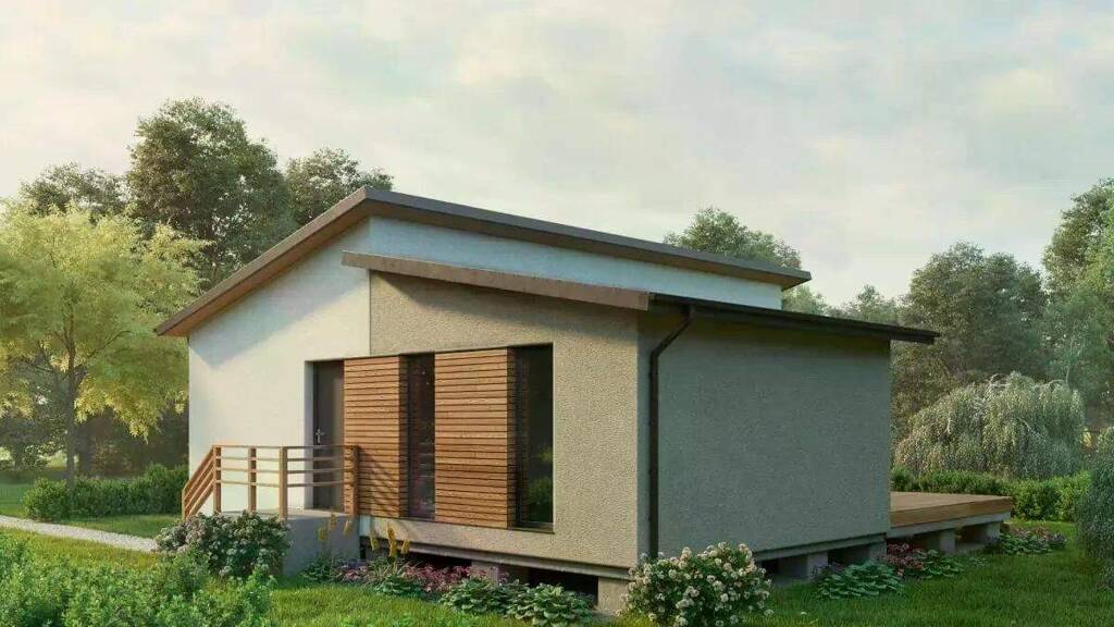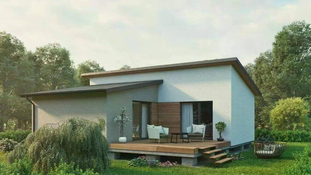 Dieses Haus wird fest auf dem Grundstück des Bauherrn errichtet und ist ideal für 2-3 Personen. Dank flexibler Grundrissgestaltung lassen sich zusätzliche Funktionen integrieren, z.?B. eine Garderobe oder ein Technikraum, indem das Zimmer angepasst und das Bad bei Bedarf etwas verkleinert wird.