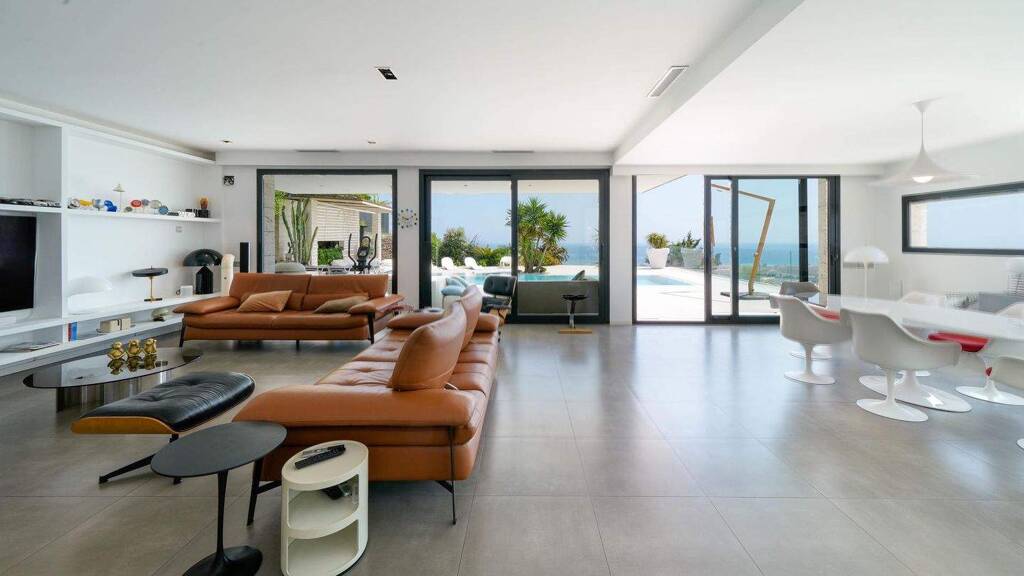 On the main floor, the spacious living-dining room, bathed in natural light, opens onto an elegant porch with a saltwater pool, creating an ideal space for relaxing, entertaining and contemplating the seascape. From this level, sea views accompany every room, reinforcing the feeling of spaciousness and exclusivity.