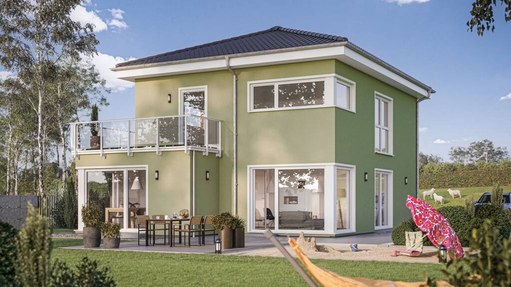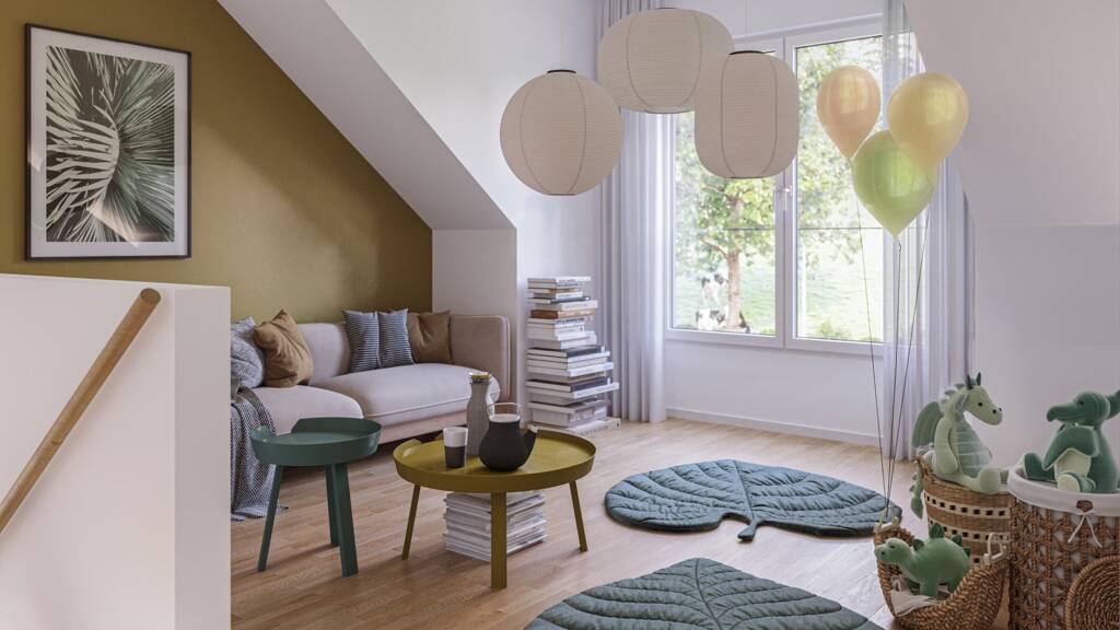 Mit insgesamt fünf Zimmern auf 130 m² Wohnfläche bietet das Haus genügend Raum für die ganze Familie. Die besondere Gestaltung wird durch einen großzügigen Übereck-Erker hervorgehoben, der den Wohnbereich im Erdgeschoss lichtdurchflutet erweitert und im Obergeschoss als Balkon dient, den du direkt vom Kinderzimmer aus betreten kannst. Hier wird das Zuhause-Gefühl großgeschrieben.