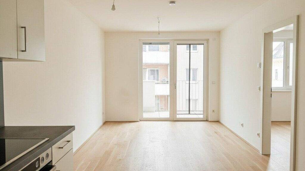 Diese schöne 2-Zimmer-Wohnung liegt im 5.Liftstock eines modernen Neubaus im 10. Wiener Gemeindebezirk. Die Wohnung verfügt über einen Eingangsbereich über den man in das die Wohnküche mit Einbauküche inkl. aller Geräte (Kühlschrank, Tiefkühler, Backrohr und Kochfeld, Geschirrspüler) sowie das ruhige Schlafzimmer gelangt. Von der Wohnküche erreicht man eine große Terrasse sowie das ruhig gelegene Schlafzimmer, das viel Platz für einen Einbauschrank bietet. Der Balkon bietet Platz für eine Sitzgelegenheit und ist aufgrund seiner Ausrichtung ideal für eine eigenen Grünoase. Das Badezimmer ist mit einer Dusche, einem Waschmaschinenanschluss, einem Handtuchwärmer und einem Waschbecken ausgestattet. Das WC ist separat. Die Wohnräume sind mit einem Vollholzparkett, die Nassräume, der Vorraum sowie die Küche sind mit Fliesen versehen.