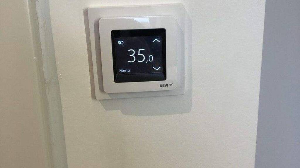 Bad mit Fußbodenheizung und Dusche sowie beheizter Handtuchhalter, Tageslichtfenster im Bad, Wandhängendes WC.