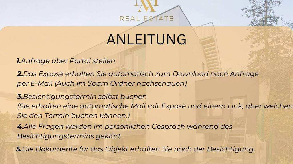 Die Immobilie hat Ihr Interesse geweckt und Sie wünschen einen zeitnahen Besichtigungstermin? Dann folgen Sie bitte den Hinweisen in der beigefügten Anleitung oder kontaktieren Sie uns direkt - wir freuen uns auf Ihre Anfrage.