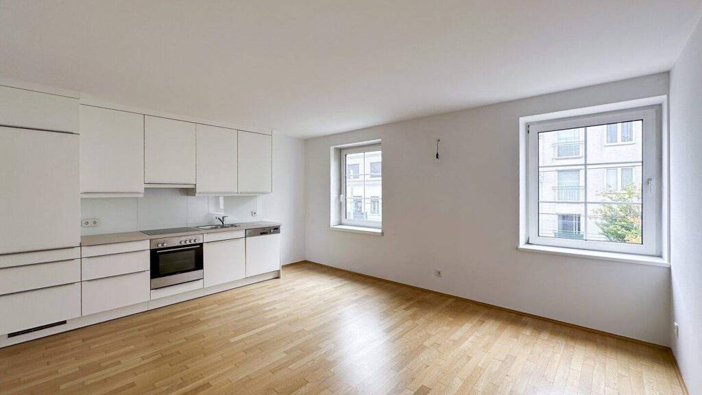 Der offene Wohn-/Essbereich mit integrierter Küche ist das Herzstück der Wohnung. Hier treffen Kochen, Genießen und Entspannen aufeinander und schaffen einen Raum, in dem Sie sich sofort zuhause fühlen.