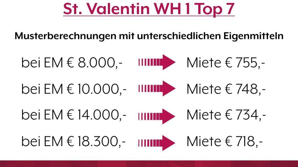 *Die regulären Eigenmittel für diese Wohneinheit betragen aktuell 18.300,-. Eine Reduktion auf mindestens 8.000,- ist auf Wunsch möglich. Natürlich sind auch höhere Beträge möglich. Bei höheren Eigenmitteln (als die Mindestbeträge) verringert sich die monatliche Miete. Beispiele dazu finden Sie am Foto: Musterberechnungen mit unterschiedlichen Eigenmitteln