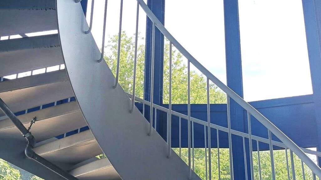Das (wahrscheinlich, leider liegen keine Pläne mehr vor) im Jahre 1992 errichtetet Gebäude bietet links der Stirnseite einen repräsentativen Eingang mit einer Wendeltreppe in das Obergeschoss. Dort befinden sich 6 helle Büroräume nebst sanitären Anlagen/Umkleideräume und einen großen Aufenthaltsbereich. Die Böden wurden mit PVC belegt.