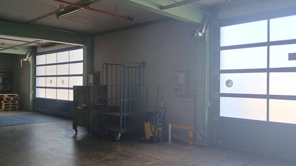 Die Anlieferung erfolgt ebenerdig über zwei Rolltore mit je einer Höhe von ca. 3,50 m. Eine Scherenrampe ist vorhanden, müsste allerdings reaktiviert werden.