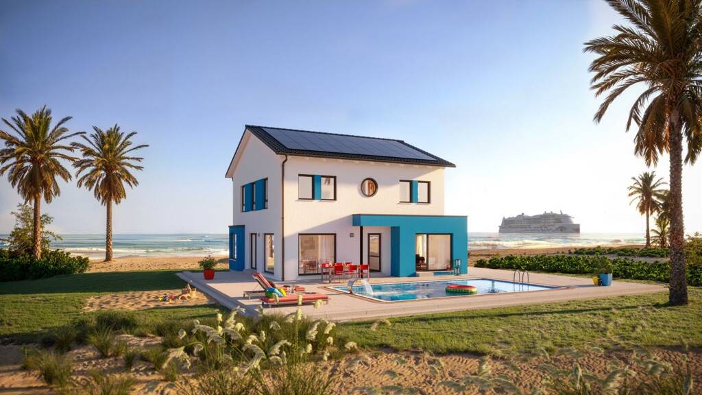 Dein Haus erhält eine vorkonfigurierte I-KON-Lösung mit Photovoltaikanlage und Speicherbatterie, moderne Wärmepumpentechnik mit Komfortlüftung und Wärmerückgewinnung sorgen für ein angenehmes Raumklima und effizientes Heizen. Im Zuhause-Paket sind hochwertige Innenausbaumaterialien enthalten, inklusive Fliesen für das Erdgeschoss und bodengleiche Duschen mit Echtglasabtrennung. Aluminiumgeschäumte Rollläden verbessern den Sonnenschutz und die Wärmedämmung.