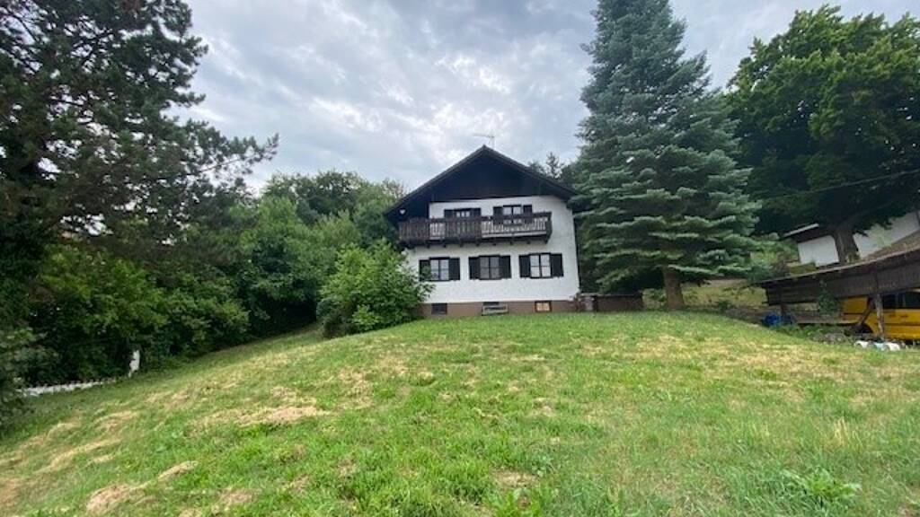 Nun zum Bestandshaus: Es ist voll unterkellert und besitzt sogar eine im UG integrierte Garage. Durch die Hanglage könnte das KG auch teilweise als Wohnraum (Praxis, Einliegerwohnung.... ) umgebaut werden. Das Erdgeschoß hat ca. 100 Wfl. mit großer Wohnküche, Flur, Gäste-WC und einem sehr großen Panorama-Wohnzimmer mit direkten Zugang auf die Sonnenterrasse (fast wie Dachterrasse) mit herrlichem Blick. Über einen Nebeneingang geht es über die Seitenterrasse in eine Einliegerwohnung (ca. 23 m² Wfl.) mit zwei Ebenen und Balkon - fast wie ein kleines Chalet. Im Dachgeschoß (ca. 65 m²) stehen drei Zimmer, ein Tageslichtbad, ein Balkon und ein Flur zur Verfügung.