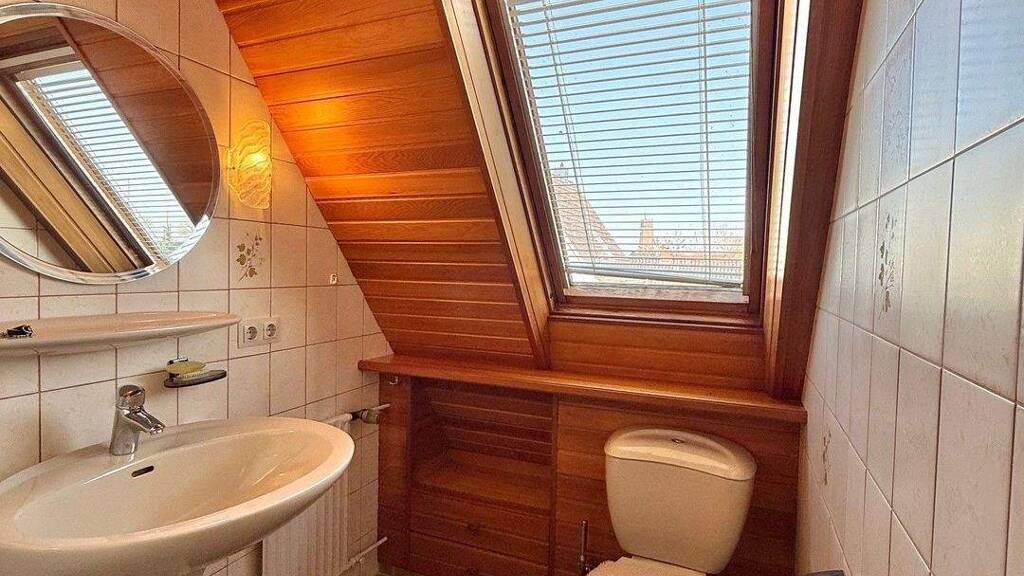 Das kleine Badezimmer im Erdgeschoss wurde renoviert und ist mit WC, Waschecken und einer modernen bodengleichen Dusche ausgestattet.
