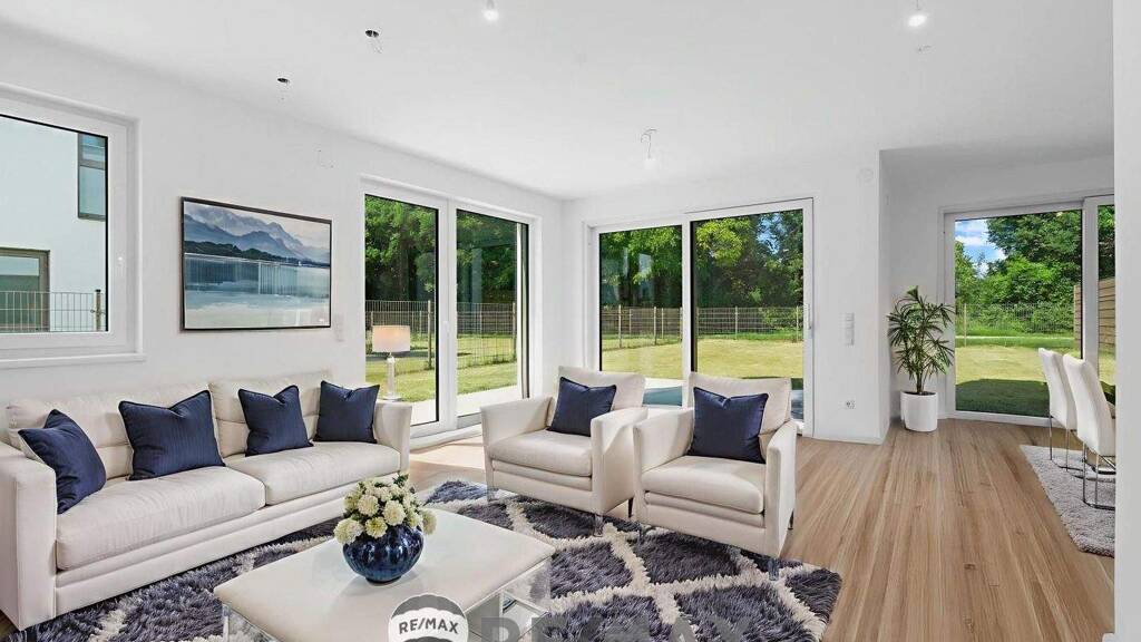 Im Erdgeschoss erwartet Sie ein großzügiger, lichtdurchfluteter Wohnsalon mit offener Küche, der zum gemeinsamen Verweilen und unvergesslichen Momenten mit Familie und Freunden einlädt. Große Fenster schaffen eine freundliche, helle Atmosphäre. Von hier aus gelangen Sie direkt auf die Terrasse und in den weitläufigen Garten, ideal für sonnige Tage im Freien und zum Entspannen.