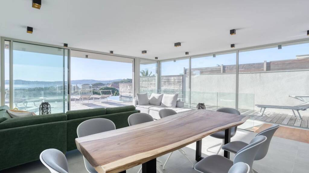 Each modern villa enjoys a splendid view of the sea, Saint-Tropez and its Gulf. Rare for sale, the estate is ideally located just 300 meters from the beach and not far from the city center and the Port of Sainte-Maxime in the heart of a privileged and nuisance-free environment.