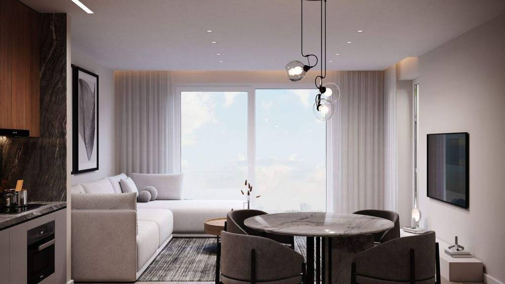 Wohn- und Esszimmer mit offener Küche: Der großzügige Wohn- und Essbereich ist offen gestaltet und umfasst eine moderne, nahtlos integrierte Küche. Von hier aus gelangt man direkt auf den Balkon, der sich ideal für entspannte Stunden im Freien eignet.