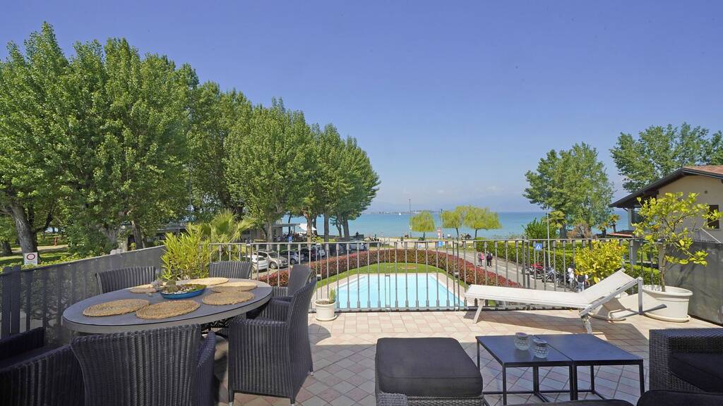 Der Zugang zur Immobilie erfolgt über einen Innenhof mit privatem Parkplatz. Die privaten Treppen erreichen die geräumige Terrasse mit herrlichem Seeblick, Pluspunkt der Wohnung: Idealer Platz, um sich zu entspannen, den Sonnenuntergang und die bezaubernde Halbinsel von Sirmione zu bewundern.