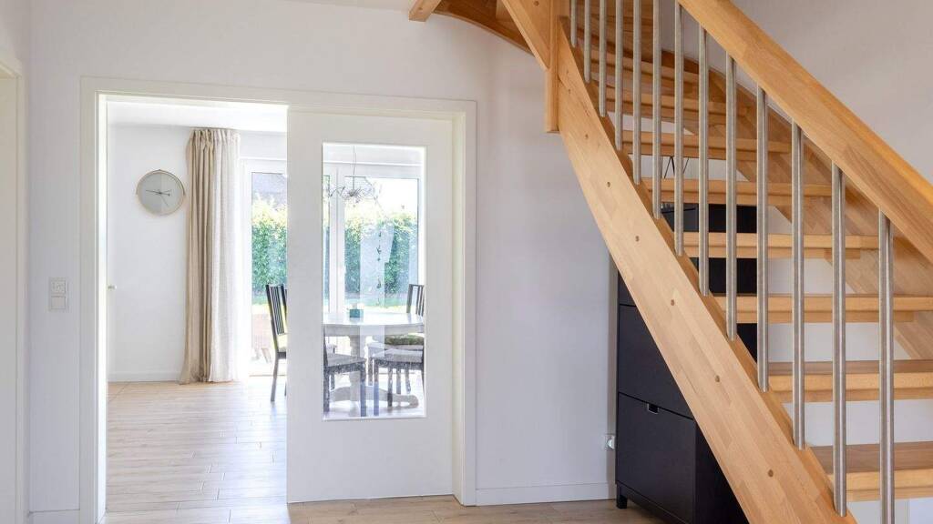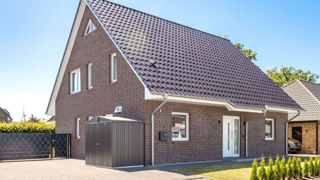 Dieses moderne Einfamilienhaus aus dem Jahr 2021 besticht durch seine gelungene Architektur, hochwertige Ausstattung und energieeffiziente Haustechnik. Die Immobilie befindet sich in einem sehr gepflegten, neuwertigen Zustand und bietet auf ca. 164 m² Wohnfläche ein komfortables Zuhause für Familien oder Paare. Der durchdachte Grundriss schafft eine klare Trennung zwischen Wohn- und Rückzugsbereichen und ermöglicht gleichzeitig ein offenes, lichtdurchflutetes Wohnerlebnis. Im Erdgeschoss erwartet Sie ein großzügig gestalteter Wohn- und Essbereich, der durch große Fensterfronten viel Tageslicht erhält und direkten Zugang zur Terrasse bietet. Ebenfalls im Erdgeschoss befindet sich ein vielseitig nutzbares Gäste- oder Arbeitszimmer. Das Gäste-Duschbad ist großzügig gestaltet. Ein Hauswirtschaftsraum mit eigenem Zugang zu den Stellplätzen und Anschlussmöglichkeiten für Waschmaschine und Trockner sowie zusätzlichem Stauraum komplettiert das Raumangebot im Erdgeschoss. Im Obergeschoss befinden sich drei weitere Schlaf- und Kinderzimmer sowie ein modernes Bad mit Dusche, Badewanne und Bidet. Das ca. 736 m² große Grundstück bietet vielfältige Nutzungsmöglichkeiten und verfügt über eine gepflegte Gartenfläche sowie eine große Terrasse. Zwei Außenstellplätze stehen direkt neben dem Haus zur Verfügung. Technisch ist das Haus auf dem neuesten Stand: Eine Erdwärmepumpe in Kombination mit Fußbodenheizung in allen Räumen sorgt für effiziente und umweltfreundliche Wärme. Zudem verfügt die Immobilie über eine kontrollierte Be- und Entlüftungsanlage, die für ein angenehmes Raumklima sorgt. Das integrierte Smarthome-System ermöglicht die komfortable Steuerung der elektrischen Rollläden und der Gartenbewässerung. Ein Glasfaseranschluss garantiert eine stabile und schnelle Internetverbindung – ideal für modernes Arbeiten und Wohnen. Das Haus von Team Massivhaus überzeugt durch eine hochwertige Wandkonstruktion, bestehend aus 17,5 cm Porenbeton, einer 3 cm Luftschicht, 12 cm Mineralfaserdämmung sowie einem 11,5 cm starken Verblendmauerwerk. Wir freuen uns auf Ihre Anfragen!