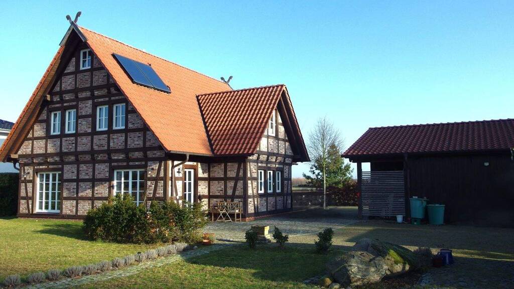 Fachwerkhaus mit besten Energiekennwerten Großes pflegeleichtes Grundstück. Fast bodentiefe Fenster- Holz- Isolierverglasung Offene Küche Vollbad Gäste WC Glasfaseranschluss Gaszentralheizung Fußbodenheizung Kaminofen Kleine Photovoltaikanlage Parkett Fußboden Moderne Kläranlage Doppel Garage mit Werkstatt Zusätzliche PKW Stellplätze
