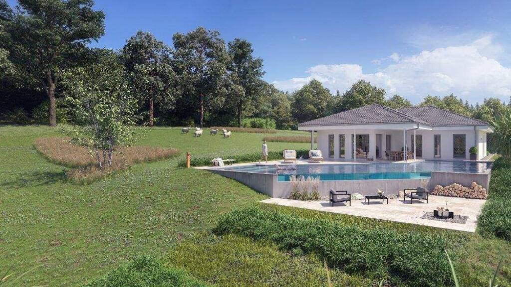 Im Inneren des Bungalows wird Wohnkomfort großgeschrieben. Das zeigt sich bereits am Eingangsbereich: Empfangen werden die Bewohner und Besucher von einer repräsentativen Diele, in der sich auch mehrere Personen gleichzeitig aufhalten können, ohne sich dabei auf die Füße zu treten. Da keine Treppe integriert werden muss, kann der Platz stattdessen für schöne Garderobenmöbel und einen großen Schuhschrank genutzt werden. Links gelangt man in den weitläufigen Wohn-, Ess- und Kochbereich, der viel Raum für eigene Gestaltungsideen lässt. Wie wäre es beispielsweise mit einer langen Theke, die zu einem netten Plausch bei Kaffee und Kuchen einlädt? Oder eine gemütliche Eckcouch, auf der man zusammen mit seinen Lieben die neuesten Serien schauen kann? In der rechten Gebäudehälfte befinden sich die privaten Ruhe- und Erholungsräume der Bewohner. Den Eltern wird ein luxuriöser Wohlfühlbereich aus Schlafzimmer, Ankleide und Bad en suite zur Verfügung gestellt. Der Nachwuchs kann sich über ein gut geschnittenes Kinderzimmer und ein separates Bad mit Dusche freuen. Ergänzt wird das Raumangebot von einem Technikraum sowie einem Abstellraum für Staubsauger und Co. Wird mehr Stauraum benötigt, dann kann der Bungalow auch unterkellert werden.