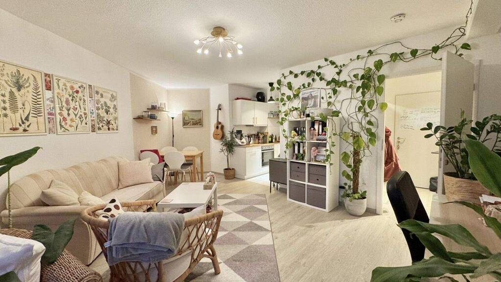 Geradeaus erreichen Sie das Herzstück der Wohnung: den offenen Wohn-, Schlaf- und Kochbereich mit bodentiefen Fenstern und Zugang zum Balkon. Der Wohnbereich ist lichtdurchflutet und bietet gemeinsam mit der offenen Küche einen attraktiven Lebensmittelpunkt. Die moderne Einbauküche ist optimal in einer Küchennische integriert und bietet ausreichend Platz zum Kochen und Verstauen.