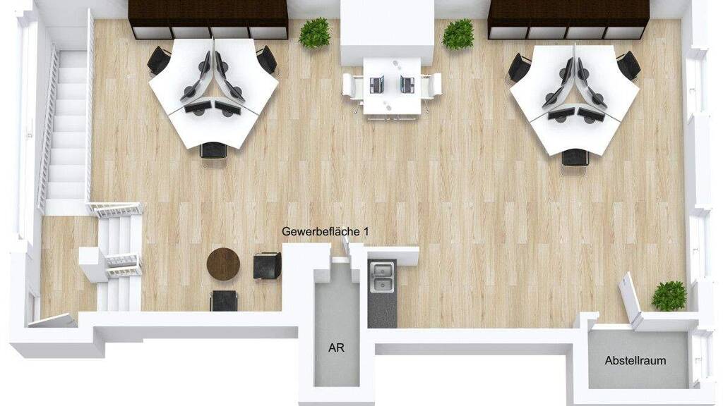 Auf derselben Etage befinden sich zudem eine praktische Teeküche sowie zwei separate Abstellräume, die ausreichend Stauraum für Arbeitsmaterialien, Akten oder Technik bieten. Die klare Trennung von Arbeits- und Nebenflächen sorgt für effiziente Abläufe im täglichen Betrieb.