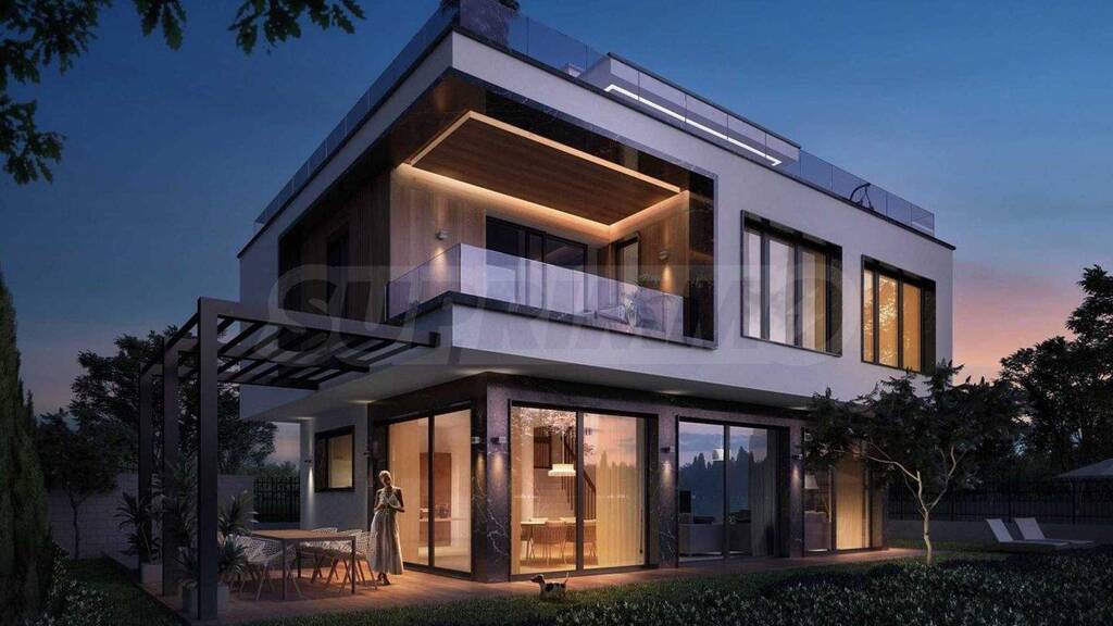 Das Anwesen umfasst eine Gesamtfläche von 177,72 m² mit einem angrenzenden Garten von 164 m², zwei Parkplätzen und einem geplanten Außenpool. Die Fassade ist modern gestaltet und in charakteristischem mediterranem Stil mit Naturstein verkleidet.