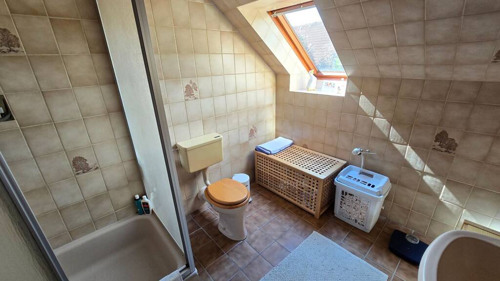 Im Obergeschoss befinden sich zwei weitere große Schlafzimmer. Auch auf dieser Etage ist ein Tageslichtbadezimmer mit Dusche vorzufinden. Aktuell bietet der großflächige Dachboden im Obergeschoss viel Nutzfläche, auch ein Ausbau zu weiteren Wohnräumen wäre hier jedoch denkbar.