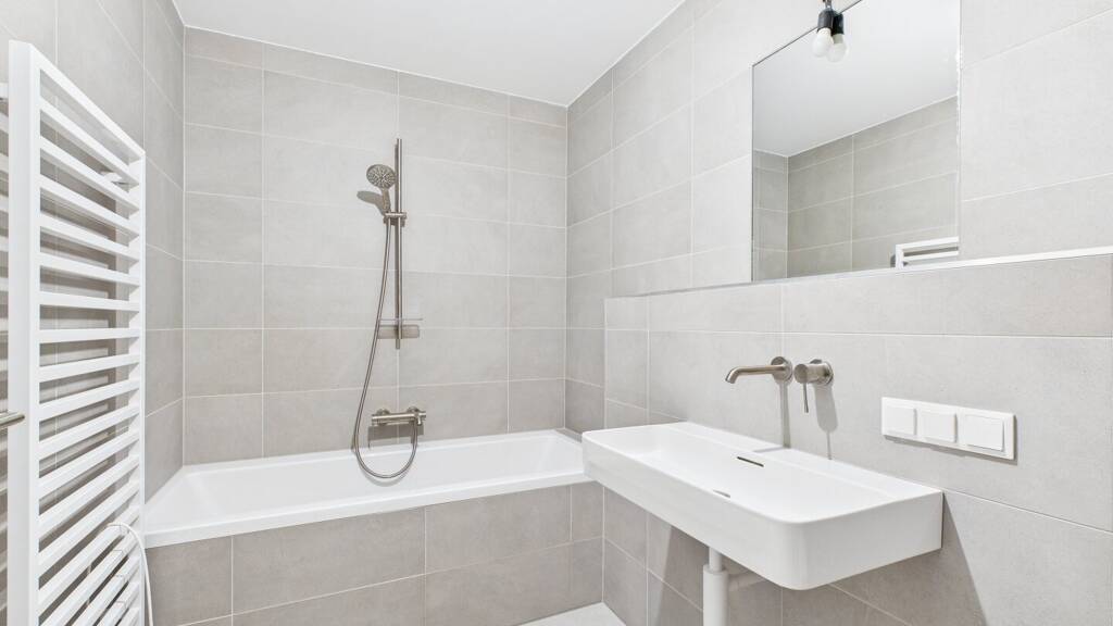 - Echtholz-Parkettböden, großformatige Fliesen in den Sanitärräumen