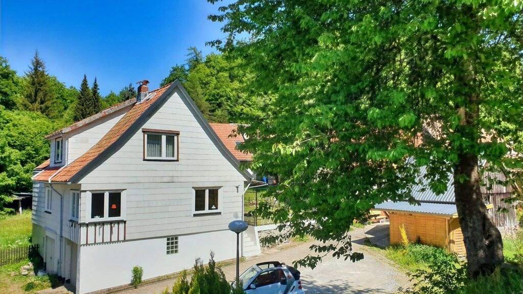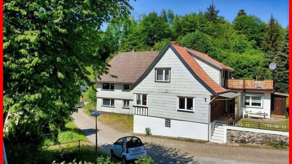 Wohnhaus mit Dachterrasse und Garage! In einem idyllischen Seitental, umrahmt von Mischwald, Bergbächlein und Weiden befindet sich dieses überwiegend massive Wohnhaus mit Satteldach (Tonziegeleindeckung) in absolut ruhiger Lage am Ende einer Sackgasse!! Vor dem Haus befindet sich öffentlicher Parkraum, eine Garage ist zudem vorhanden! Über eine massive Treppe (8 Stufen) erreicht man den überdachten Hauseingang an der Ostseite. Eine zentrale Diele mit Garderobe nimmt einen in Empfang. Im Erdgeschoss befinden sich die Küche (mit Einbauküche und Heiz-Therme), Wohn- & Esszimmer mit harztypischem Kaminofen (neu in 2023), ein Schlafzimmer, Hauswirtschaftsraum sowie separat ein WC und das Tageslicht-Dusch- & Wannenbad! Eine massive, mosaikbelegte Treppe führt in das Dachgeschoss. Hier befinden sich vier weitere Schlaf- oder Gästezimmer sowie ein Gäste-WC und die fantastische Dachterrasse über dem massiven Anbau von ca. 1960. Das Kellergeschoss ist über die Garage (Westseite), eine zusätzliche Kellertür sowie durch die Diele im Erdgeschoss begehbar. Hier befinden sich neben der Garage (ca. 4,6 m tief) eine Werkstatt sowie ein weiterer Lagerkeller.