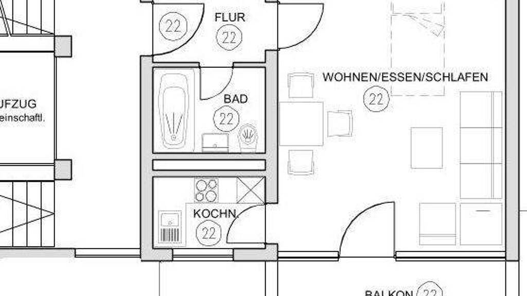- 1 Zimmer, Eingangsbereich, Küche, Bad, Balkon