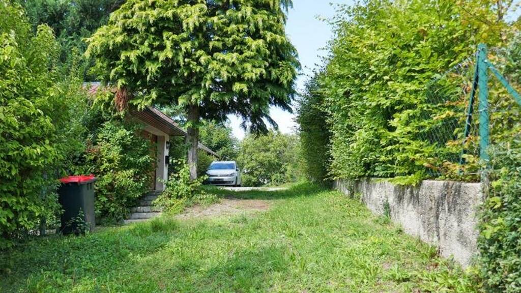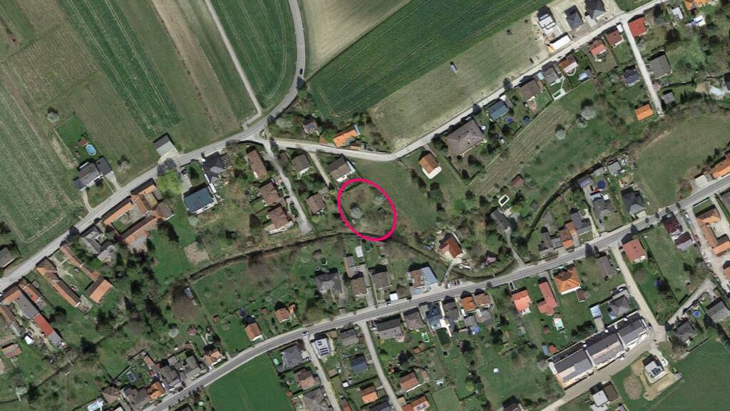 Das nach Südosten, in zweiter Reihe zur Straße ausgerichtete Grundstück liegt auf einem leichten Südhang, wird an der Talsohle im Süden von einem kleinen Bach begrenzt und soll nun geteilt werden.
