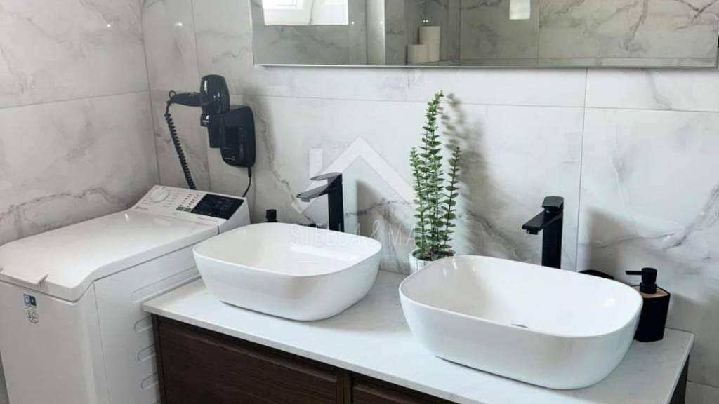 Im Erdgeschoss befindet sich eine große Wohnung mit einem geräumigen Wohnzimmer mit Küche und Esszimmer, drei Schlafzimmern, einem Badezimmer, einer Toilette und einer überdachten Terrasse. Eine Innentreppe führt in den ersten Stock des Hauses, wo sich auch eine Wohnung mit der gleichen Aufteilung befindet. Jedes Zimmer ist klimatisiert.