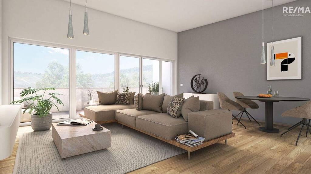 Die 2- bis 4-Zimmerwohnungen bieten Wohnflächen zwischen ca. 69 m² und 129 m², durchdachte Grundrisse und helle Räume. Jede Einheit verfügt über Terrasse, Balkon oder Dachterrasse mit Blick auf Weinberge, grüne Umgebung oder den Bach. Vier Maisonette-Wohnungen schaffen zusätzlich ein besonders großzügiges Raumgefühl über zwei Ebenen.