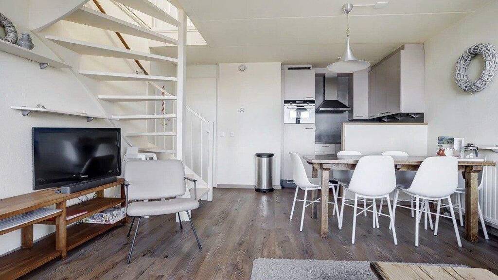 Das Wohnzimmer ist ohne Zweifel das Herz des Hauses. Dieser Raum ist durch die großen Dachfenster auffallend hell und vermittelt ein offenes und entspanntes Wohngefühl. Der freie Blick über das Grevelingenmeer verleiht dem Wohnzimmer etwas Besonderes; zu jeder Tageszeit verändert sich hier die Kulisse. Es gibt ausreichend Platz für eine komfortable Sitzecke und einen Esstisch, sodass dies wirklich ein Raum ist, um zusammenzukommen, zu entspannen und die Umgebung zu genießen. Vom Wohnzimmer aus gelangt man direkt auf den Balkon zur Wasserseite.