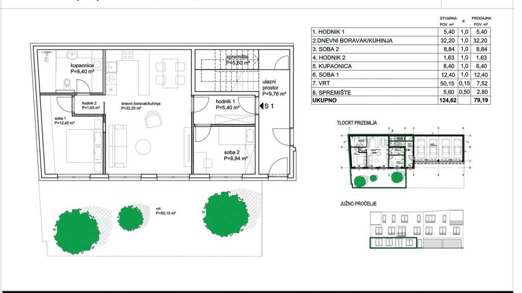 Stan je netto povrsine 77,19m2 te se sastoji od hodnika 1, dnevnog boravka, kuhinje i blagovaonice, hodnika 2, 2 spavace sobe, kupaonice i vrta od 50m2 (obracunski 7,52m2).