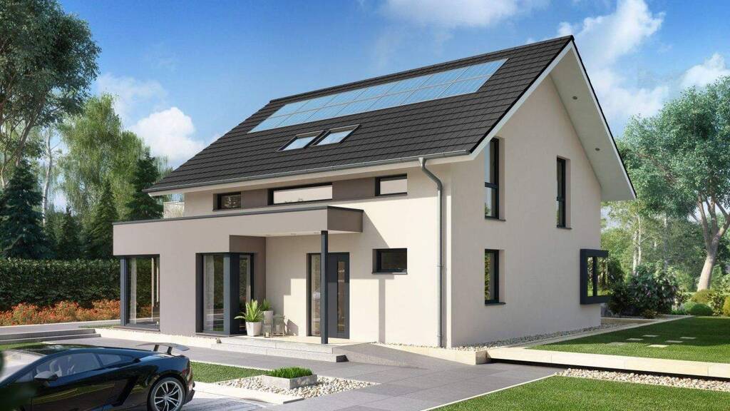 Dieses Einfamilienhaus bringt mit seinen individuellen Gestaltungsmöglichkeiten Schwung ins monotone Siedlungseinerlei. Von außen besticht der Zweigeschosser durch den dezenten Hell-Dunkel-Kontrast und die attraktiven Fensterformate, die von schmalen Lichtbändern über bodentiefe Verglasungen bis hin zum Panorama-Eckfenster reichen. Unterstrichen wird das edle Design durch den Übereck-Erker, der sich auf elegante Weise in eine moderne Eingangsüberdachung verlängert, sowie durch das über beide Etagen reichende Querhaus.