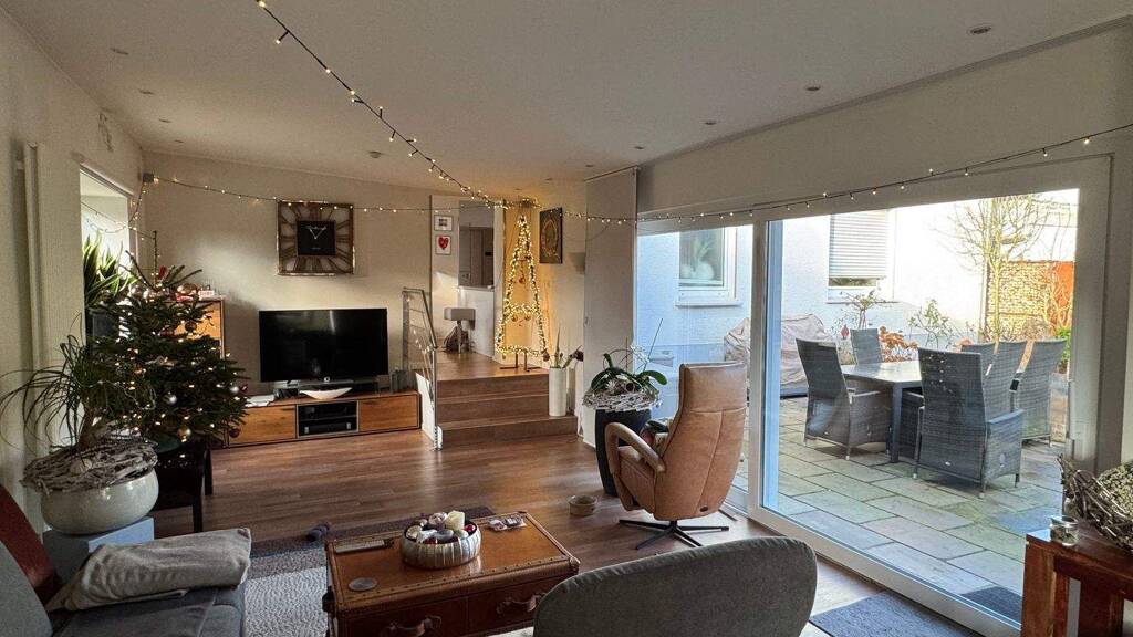 Ein stilvoller Kamin bietet zusätzlichen Komfort und Gemütlichkeit. Von hier aus haben Sie direkten Zugang zur Terrasse und dem geschmackvoll gestaltetem Außenbereich der zum Entspannen und Verweilen einlädt.