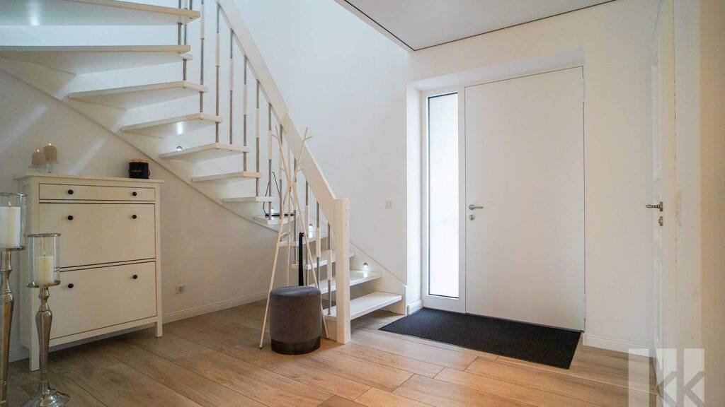 Schon beim Betreten des Hauses beeindruckt die Großzügigkeit des Eingangsbereichs und eröffnet den Blick auf die stilvoll gestalteten Wohnräume. Im Erdgeschoss erwartet Sie ein privater Elternbereich mit einem großzügigen Schlafzimmer, einer exklusiven Ankleide sowie einem luxuriösen Bad mit Natursteinteppich und freistehender Wanne - ein Rückzugsort, der wie ein privates Spa wirkt.