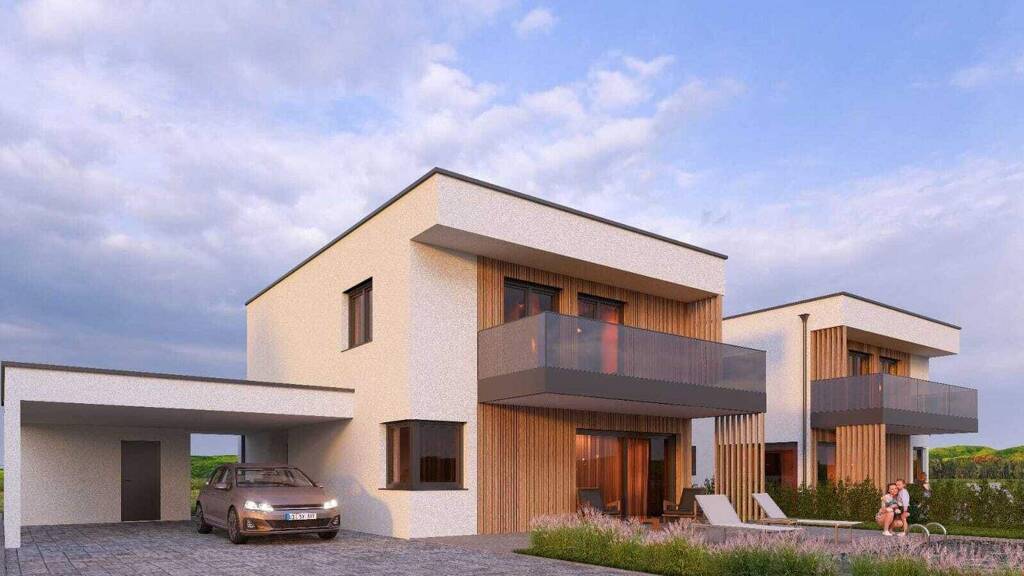 + Erstbezug; Baustart erfolgt nach Vereinbarung + Modernes, farblich abgestimmtes und ansprechendes Design + Ziegelmassivbau 25 cm Ziegel mit 16 cm Vollwärmeschutz inkl. Silikonhartzputz 2 mm + Innenwände: Hochlochziegel mit 12 cm Wandstärke + Luftwärmepumpe; Fußbodenheizung mit Raumthermostat regelbar + Decken und Bodenplatte aus Stahlbeton; inkl. Trittschalldämmung + stilvolle Feinsteinzeug-Fliesen, sowie Landhausdielen-Parkett inklusive + Flachdach mit EPS-Wärmedämmung + INTERNORM: 3-fach Wärmeschutzverglasung Kunststoff mit Alu-Vorsatzschale und flächenbündiger Optik außen + großzügige Schiebetüre zur sonnigen, ebenerdigen Terrasse + elektrische Beschattung mittels randgebördelte Alu-Lamellen (EG) und Rollos (OG) + sonniger Balkon mit Feinsteinzeugplatten, Maße: 60x60 cm + Zaun: Stabmatte (anthrazit) mit einer Höhe von 150 cm + Humusierung und Besamung der Gartenflächen wird vor Übergabe durchgeführt + Regenwasser: Sickerschächte am Grund + EXTRAS: Photovoltaik-Anlage inklusive! + zwei überdachte Abstellplätze