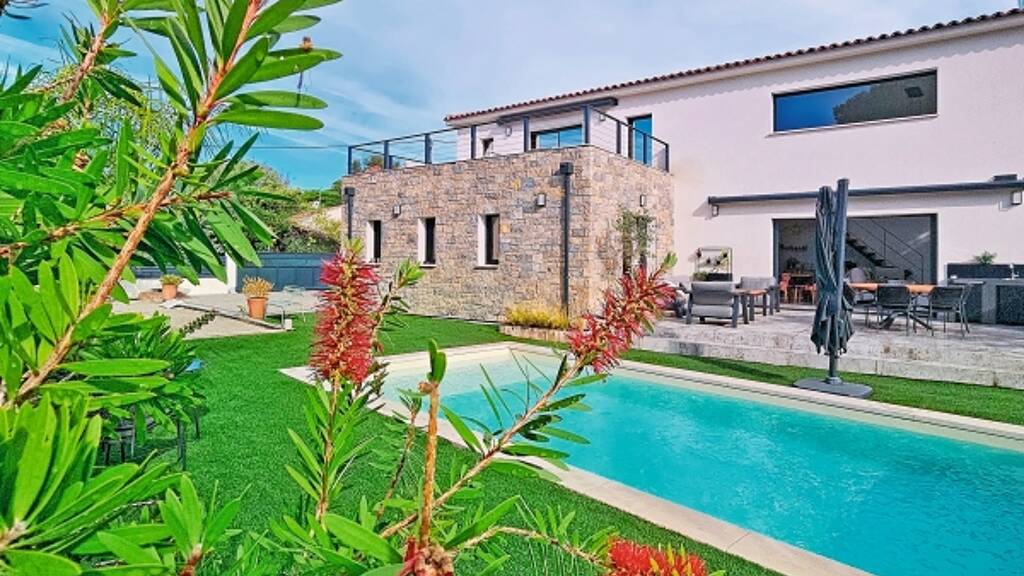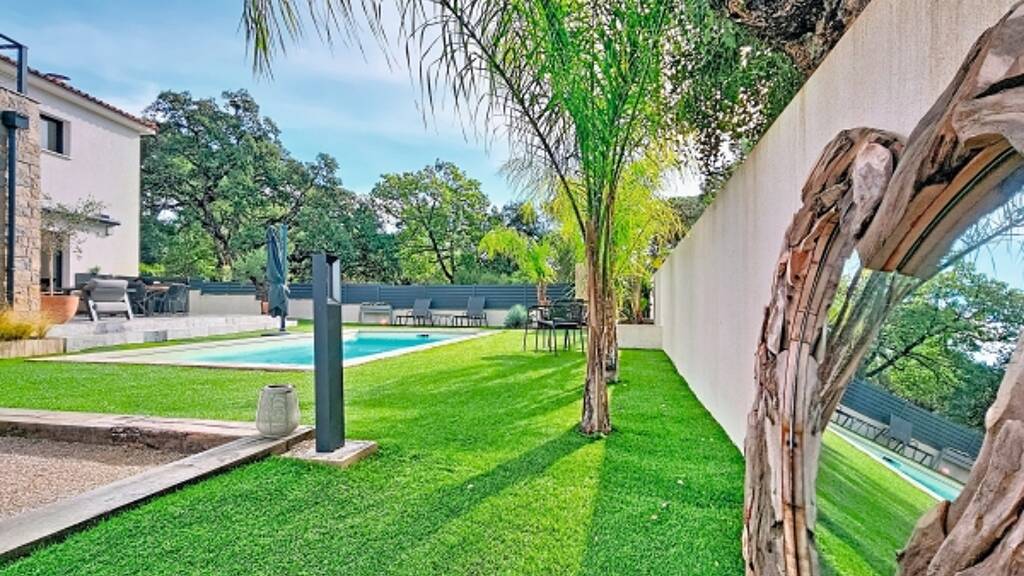 Contemporary villa built in 2023 meeting current standards and set in grounds edged by open greenery. On the ground floor, it offers a vast bright living room with cathedral ceiling, an equipped open-plan kitchen, a terrace, heated & salt-treated pool, master suite with walk-in closet and shower room, heated garage. On the upper level, a mezzanine, 2 bedrooms - one with a bathroom and terrace.