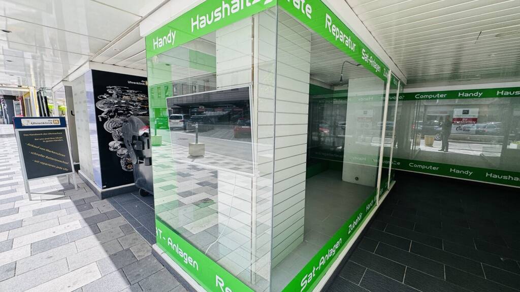 Große Schaufensterfront mit automatischer Glastür zum frequentierten Hauptplatz