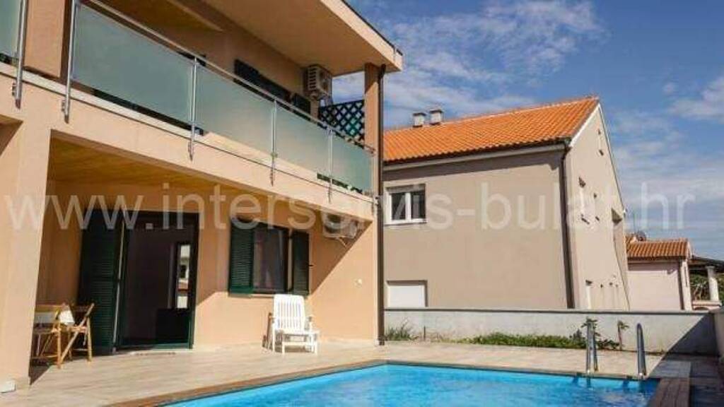 .::: Ekskluzivna energetski stedljiva katnica :::. Moderna katnica smjestena samo 200m do plaze Zamalin, nudi 619,93 bruto povrsine i visok nivo kvalitete zivota na tri razine. U prizemlju kuce nalaze se potpuno opremljeni stanovi ( jedan s dvijespavace sobe, a drugi s jednom spavacom sobom), natkrivenom i otvorenom terasom na kojoj je velikim bazen.Etaze su povezane unutarnjim stepenicama od drva, a stan na katu na zapadnoj strani kuci i vanjskim stepenicama. Na katu su uredeni stanovis velikim i svijetlim prostorijama i natkrivenim terasama. Jedan stan ima dvije spavace sobe dok drugi raspolaze s jednom spavacom sobom. Potkrovlje je nedovrseno ali su provedene instalacije struje i vode. I planu su dva stana ili wellness i fitness prostor. Objekt raspolaze i s podrumom od 46,40m2. Pri gradnji kuce pazljivo su birani materijali koji stede energiju (pasivna kuca) te osiguravaju lagodan zivot ljeti i zimi, a poseban karakter kuci daju kamene ploce s kojima je oblozena gotovo cijela parcela. Ogradeno dvoriste pruza parking za 7 automobila. Kuca se prodaje potpuno namjestena.