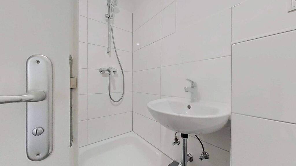 Das moderne Badezimmer ist mit weißen Fliesen gestaltet und bietet eine komfortable Dusche sowie einen Handtuchheizkörper. Es ist funktional und stilvoll zugleich, sodass Sie sich hier rundum wohlfühlen können.