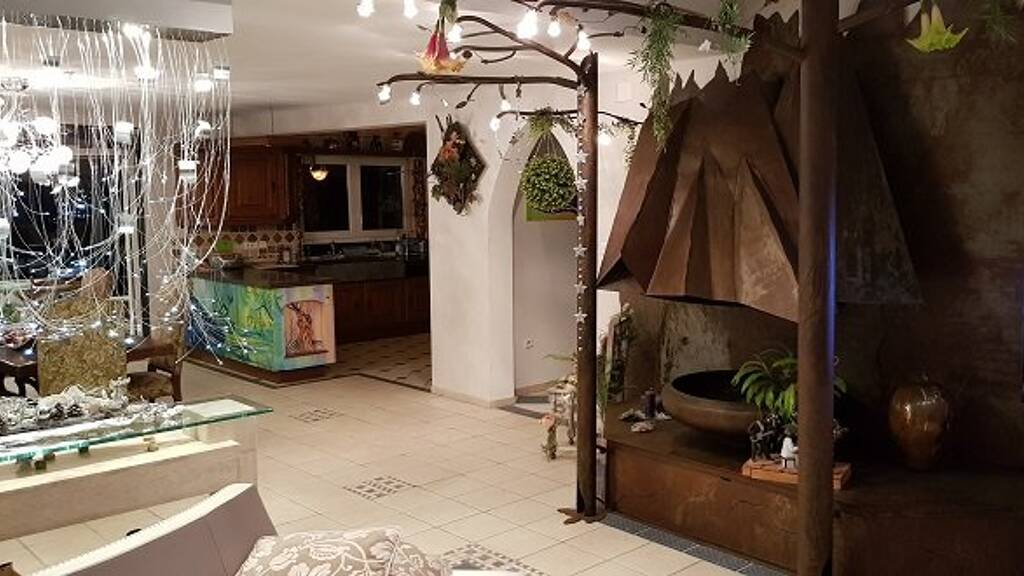 - Wunderschöne Wendeltreppe (Designer) - Großes Ess-Wohnzimmer zum Wintergarten hin, große Terrasse mit Blick auf Fischteich und angelegtem Garten - besonderes Kamin, von Designer , einzigartig - Wunderschöne EBK im Wert von ca. 30.000,- - Schlafzimmer mit Wandschränken - Dusche mit Waschküche