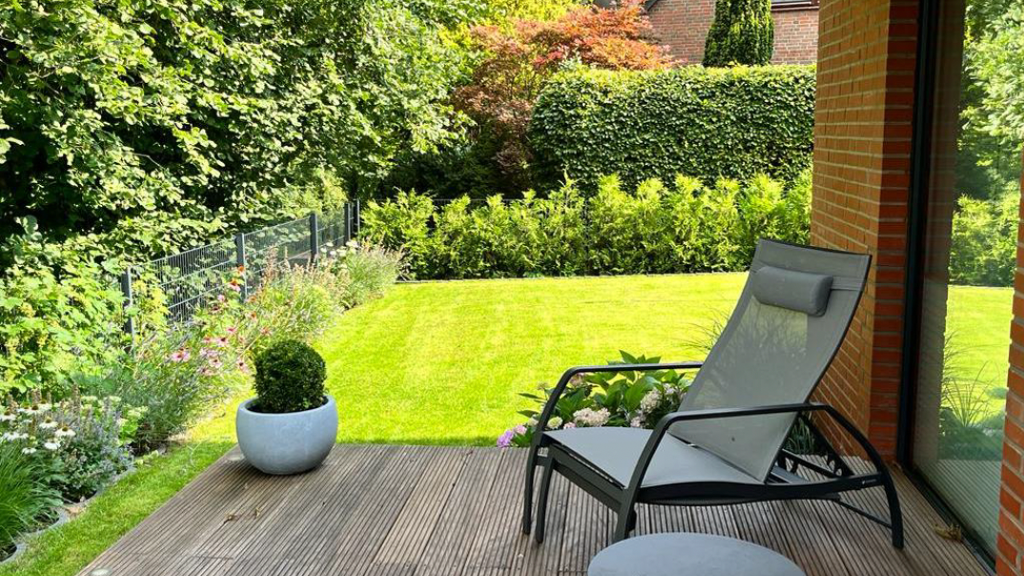 Der Außenbereich des Objektes ist vollständig eingezäunt und eingefriedet, die Zuwegungen sind mit hochwertigen Pflastersteinen belegt, eine Terrasse mit Granit und die zweite mit Tropenholz, direkt am Haus befinden sich ein Carport, ein zusätzlicher Raum für Gartengeräte inklusive Holzlager, die gesamten Außenanalgen wurden von einem Garten- und Landschaftsbauer angelegt und mit kleinen Blumeninseln bestückt.