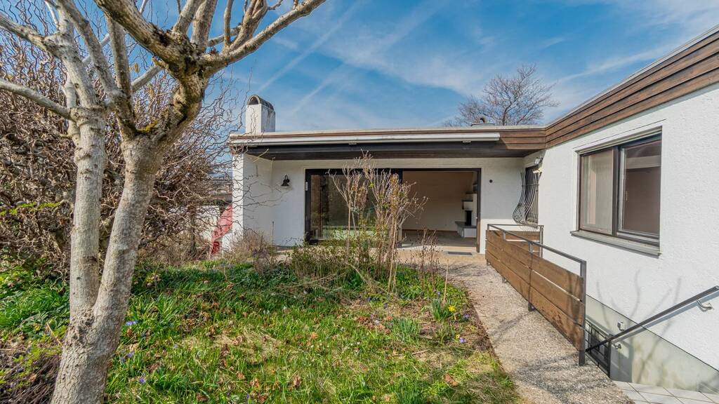 Der Bungalow wurde 1980 in solider Massivbauweise errichtet und bietet ca. 130 m² Wohnfläche auf einer Ebene - ein Wohnkonzept, das Komfort und Alltagstauglichkeit ideal verbindet. Herzstück des Hauses ist der großzügige Wohnbereich mit beeindruckendem Panoramafenstern, welche den Blick ins Grüne freigeben und für eine helle, freundliche Atmosphäre sorgen. Ein Kachelofen mit offener Feuerstelle unterstreicht den gemütlichen Charakter des Hauses.